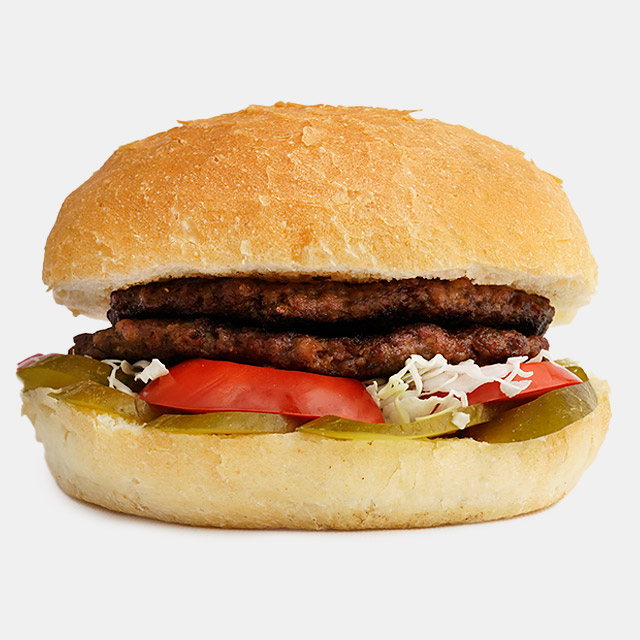 یک عدد برگر دست ساز گوشت مخلوط گوساله و گوسفندی ۱۲۰ گرمی، یک عدد برگر دست ساز مرغ ۱۲۰ گرمی، قارچ، پنیر پیتزا، خیارشور، گوجه، کاهو، سس مخصوص، نان گرد