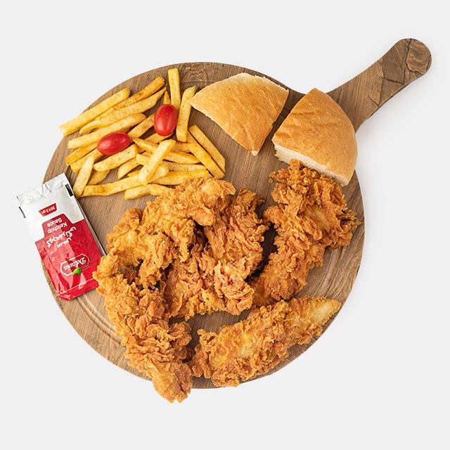 فیله سوخاری، سیب زمینی سرخ شده، سس سیر، سس کچاپ، سس انار. نان باگت