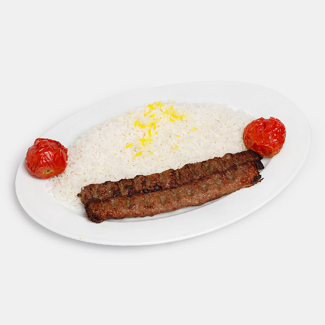 2 سیخ کباب کوبیده گوشت گوسفندی 70 گرمب، 330 گرم برنج خارجی